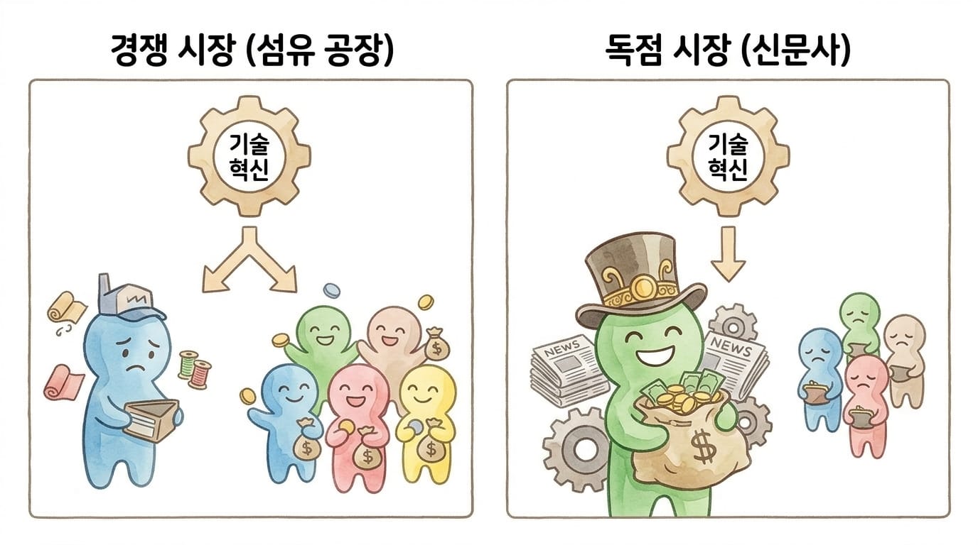 왜 그랬을까요? 섬유는 누가 만들어도 비슷한 범용 상품입니다. 모든 경쟁자가 같은 기계를 도입할 수 있기 때문에, 생산성이 올라가도 그 혜택이 전부 구매자에게 넘어갑니다. 소유자에게 남는 건 더 비싼 기계를 사야 하는 부담뿐입니다.
