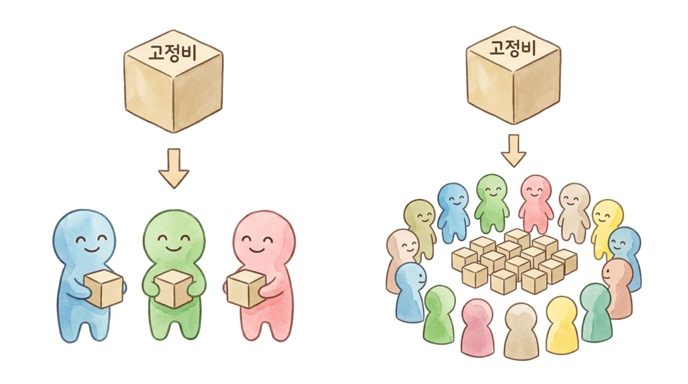 소프트웨어의 비용은 대부분 개발자 인건비, 즉 고정비입니다. 한번 만들어 놓으면 추가 사용자에 대한 비용이 거의 0에 가깝습니다. 1명을 위해 개발하든 1,000만 명을 위해 개발하든 개발 비용은 거의 같습니다. 거래량(Q)이 많아질수록 거래당 비용이 급격히 낮아지는 이 확장성이, 소프트웨어가 제품 유형으로서 갖는 가장 강력한 경제적 특성이었습니다.