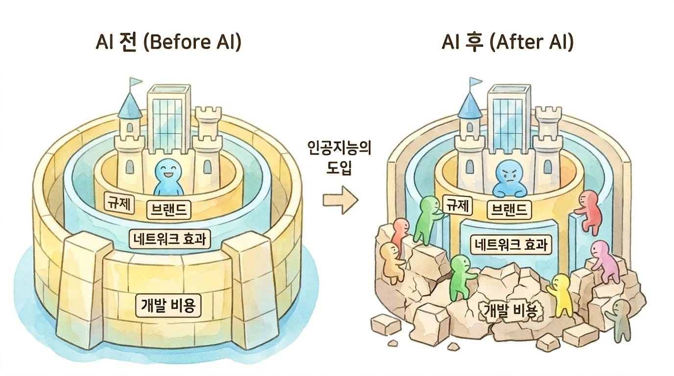 이것이 소프트웨어 기업의 모든 해자가 약해진다는 뜻은 아닙니다. 네트워크 효과, 브랜드, 규제처럼 독립적으로 작동하는 해자들은 여전히 유효합니다. 하지만 소프트웨어를 만드는 비용 자체가 진입 장벽이었던 영역에서는, 그 장벽이 빠르게 낮아지고 있습니다. 그리고 그런 영역에서는, 소프트웨어 바깥에 있는 경쟁 우위 요소들—브랜드 신뢰, 규제 인허가, 오프라인 네트워크—의 상대적 중요성이 올라갑니다.